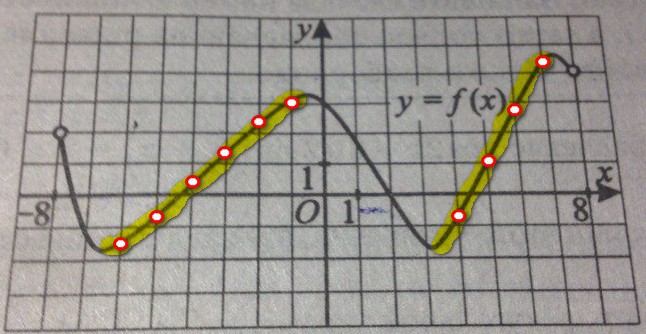 Области возрастания функции показаны во втором вложении желтым. По заданию нужно учитывать только те точки, в которых х целочисленно. Они показаны красным. Подсчетом получаем 10 точек.