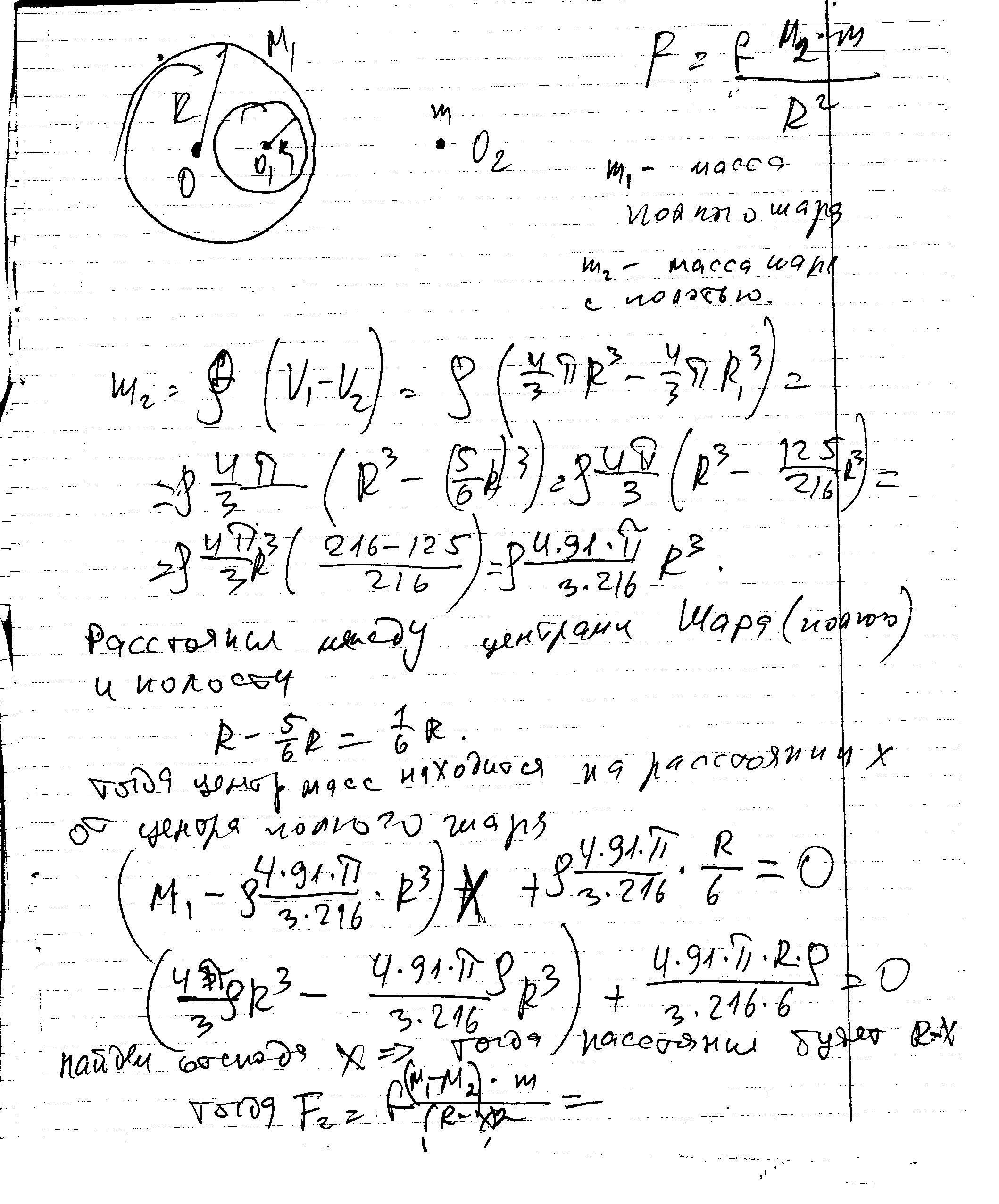 Это садизм, а не задача. Считать не буду. Отметьте нарушение, если и Вам лень. Уверен только в технологии. Учесть разность масс и изменившееся расстояние до центра масс шара с полостью