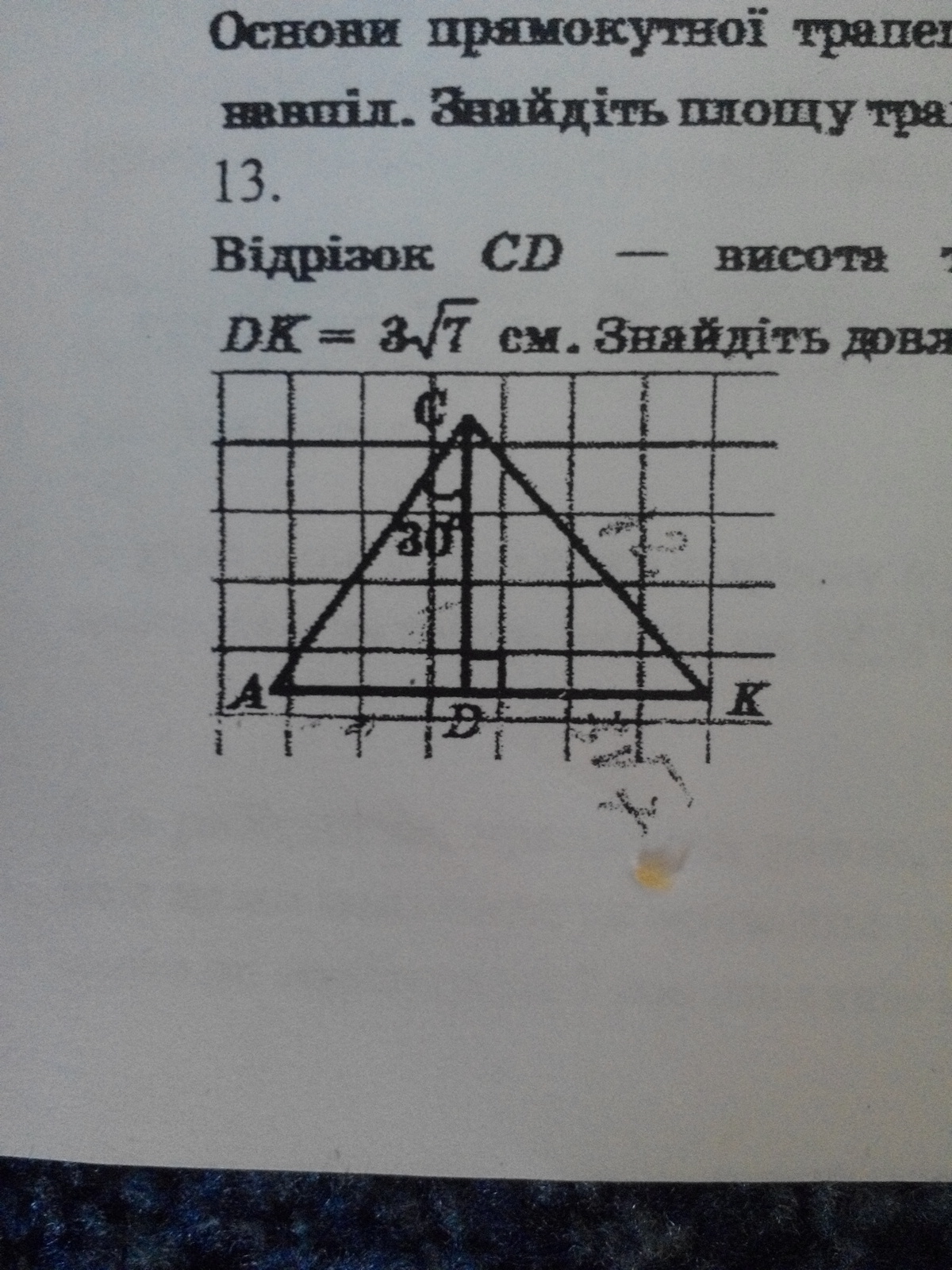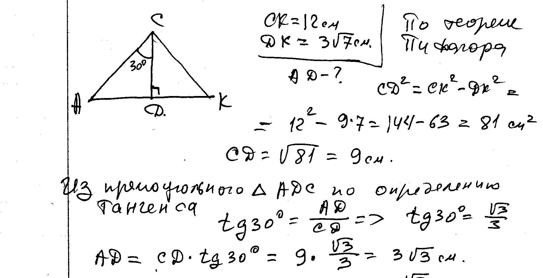 13) Вiдрiзок CD - висота трикутника АСК,зображеного на рисунку , СК=12см , DK=3√7см. Знайдiть довжину вiдрiзка AD.