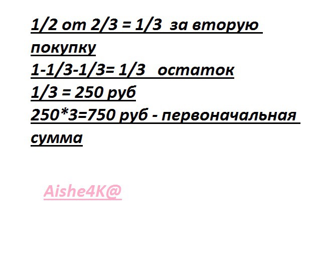 за 1-ю покупку покупатель заплатил 1/3 всех имеющихся у него денег , а за 2-ю 1/2 остатка, после чего у него осталось 250 рублей Ск. денег было у покупателя первоначально