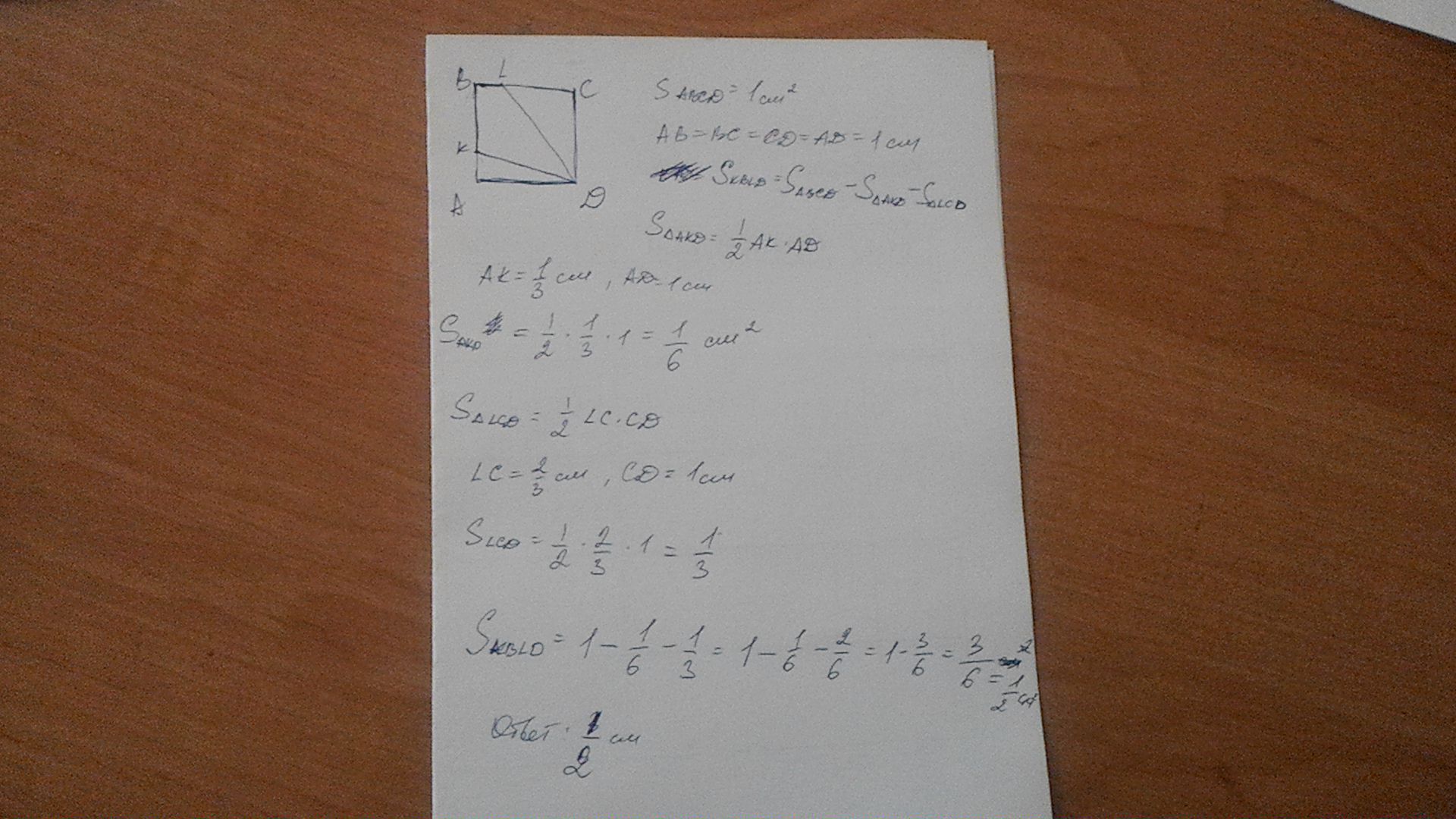 2. Т.к. АК=13 АВ, получаем, АК=1/3см, AD=1cм. Найдем площадь получившегося треугольника KAD