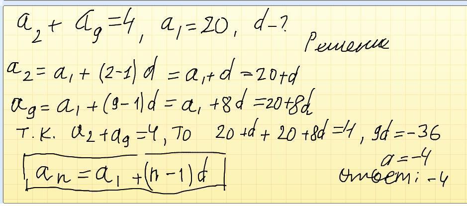 если в арифметической прогрессии сумма второго и девятого членов равна 4 , первый член равен 20 , то разность прогресии равна