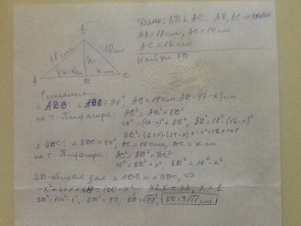 З точки до прямої проведено дві похилі довжини яких дорівнюють 10 і 18 см, а сума їх проекцій на пряму дорівннює 16 см знайдіть відстань від даної точки до цієї прямоі.