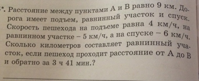 Пусть подъем дорога было z км. равнинный x км. а спуска y км. По условии задача получим следующие системы x+y+z=9 ( z/4+x/5+ y/6)+ (y/4+x/5+y/6)= 221/60 (3час 41мин=221/60ч) . z+y=9-x , (z+y)/4+ 2x/5+(y+z)/6=221/60, (9-x)/4+2x/5+(9-x)/6= 221/60, (15*(9-x)+12*2x +10*(9-x))/60= 221/60 , 135-15x+24x 90-10x=221 , -x=221-225, x=4 .
