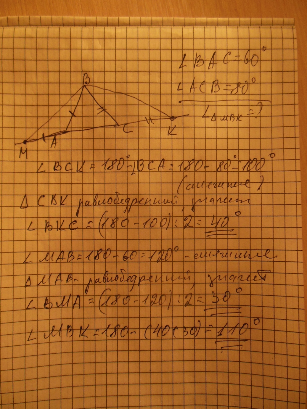 На продолжениях стороны АС треугольника АВС за точки А и С отметили соответственно точки М и К тка, что АМ=АВ, СК=ВС. Найдите углы треугольника МВК, если угол ВАС=60 градусов, угол АСВ=80 градусов