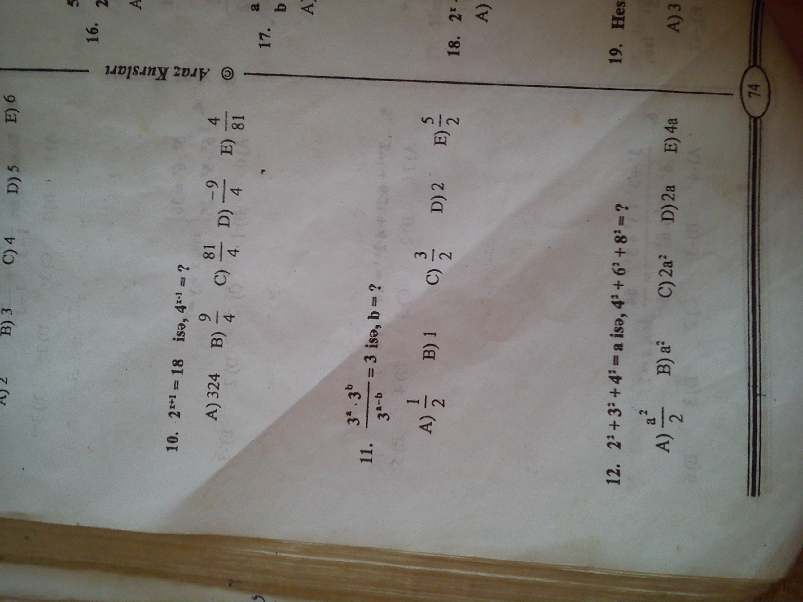 10)quad 2^{x+1}=18; ; to ; ; 2^{x}cdot 2=18; ,; ; 2^{x}=9; ,; ; x=log_29\\4^{x-1}=4^{x}cdot 4^{-1}=2^{2x}:4=2^{2log_29}:4=2^{log_29^2}:4=9^2:4= frac{81}{4} \\11)quad  frac{3^{a}cdot 3^{b}}{3^{a-b}} =3; ; to ; ;  frac{3^{a+b}}{3^{a-b}} =3; ; to ; ; 3^{a+b-(a-b)}=3; to \\3^{2b}=3; ; to ; ; 2b=1; ; to ; ; b=frac{1}{2}