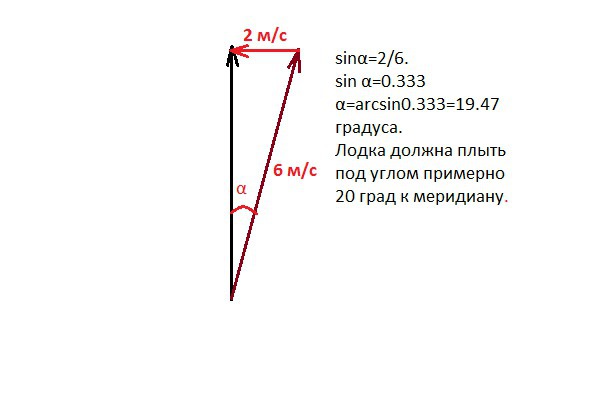 Моторная лодка имеющая в системе отсчёта , связанной с водой, скорость 6 м/с, должна переправиться через реку по кратчайшему пути. Какой курс относительно берега необходимо держать при переправе, если скорость течения реки 2 м/с?