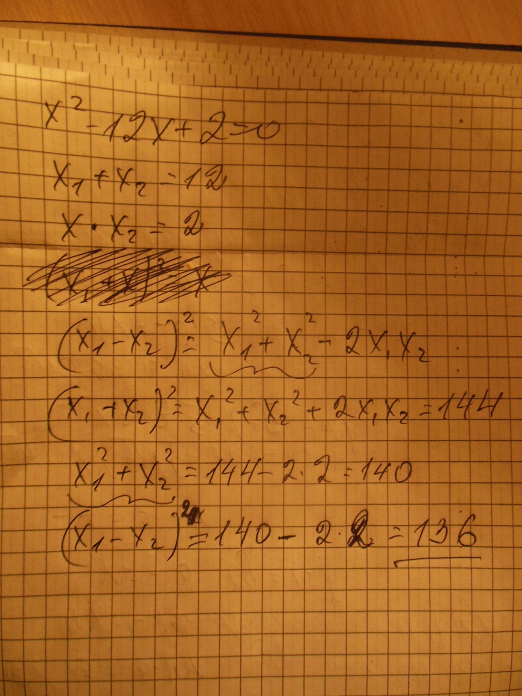 Если квадратное уравнение х^2-12х+2=0 имеет корни х1 и х2, то , не вычисляя их, найдите значение числового выражения x1^2-x2^2. Помогите пожалуйста.