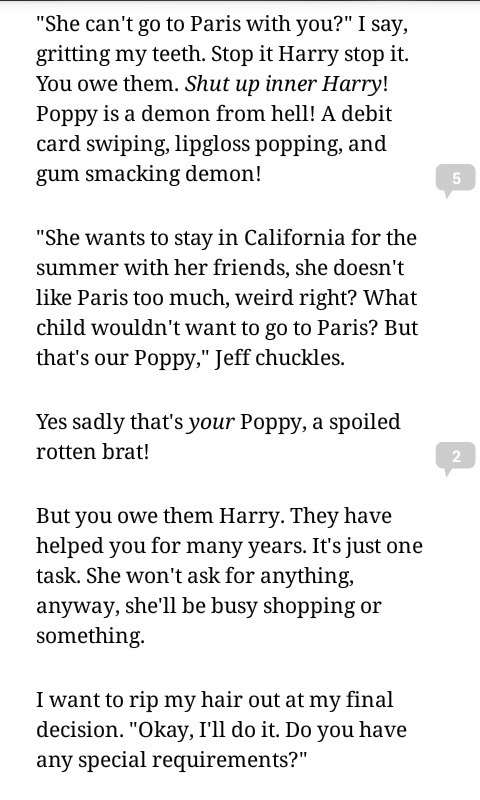 "А разве она не может поехать с вами в Париж?" - говорю я, скрипя зубами. А про себя прошу : "Прекрати, Гарри, прекрати так. Ты им обязан. Замолчи же! Да, Поппи - это адская чертовка, только и думающая о том, как опустошить кредитки, облизывающая помаду на губах и постоянно жующая жвачку."