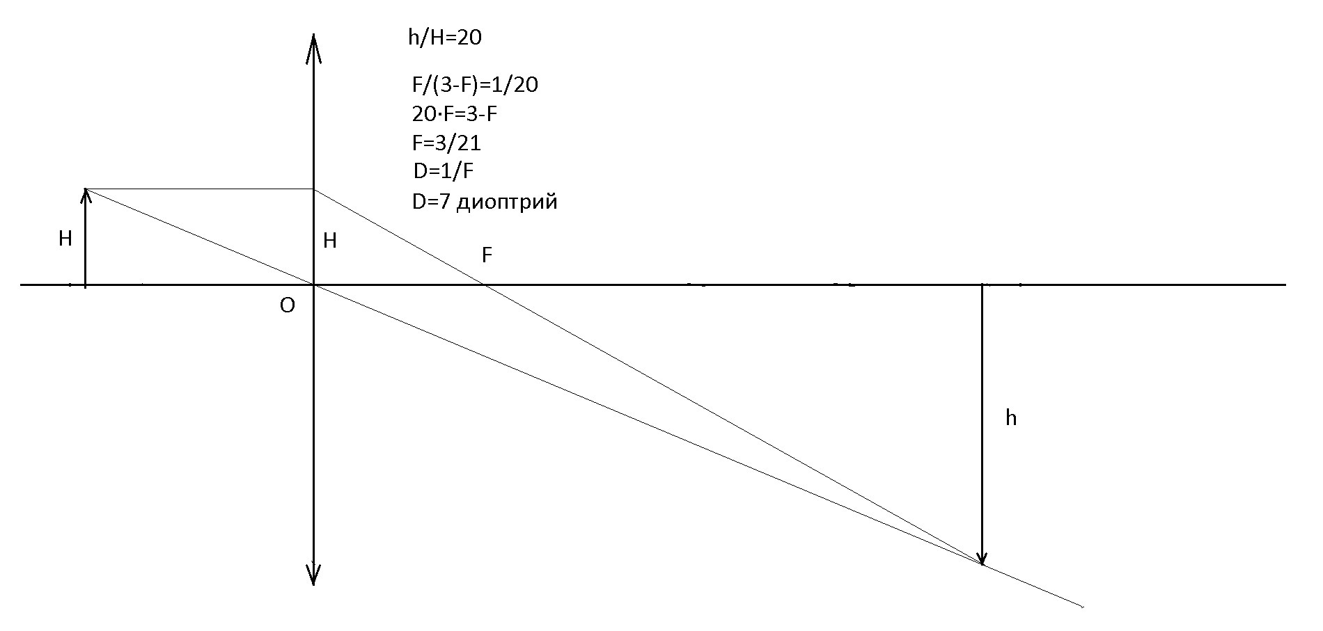 при помощи сообирающей линзы полученно увелечение в 20 крат изображение на экране, удаленном на 3 м от оптического центра. какова её оптическая сила