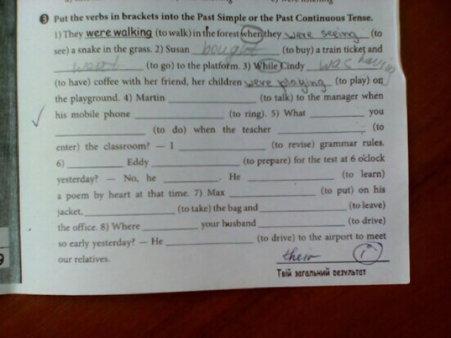 4) Martin was talking to the manager when his mobile phone rang. 5) - What was you doing when the teacher entered the classroom? - I was revising grammar rules. 6) - Was Eddy preparing for the test at 6 o'clock yesterday? - No, he wasn't. He was learning a poem by heart at this time. 7) Max put on his jacket, took the bag and left the office. 8) - Where did your husband drive so early yesterday? - He was driving to the airport to meet our relatives.