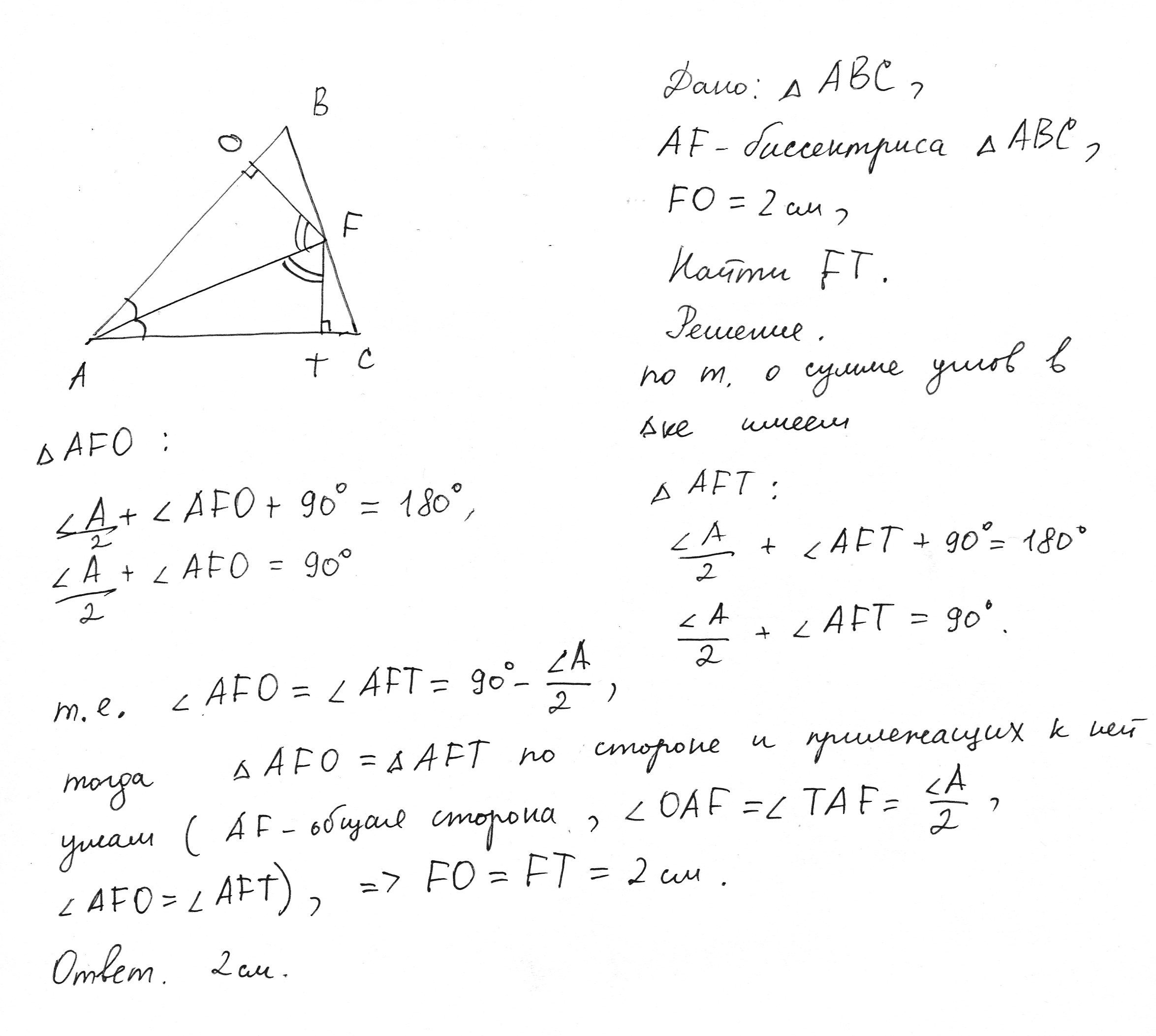 Отрезок AF биссектриса треугольника ABC,высота FO треугольника ABF равна 2см.Чему равна высота FT треугольника AFC??