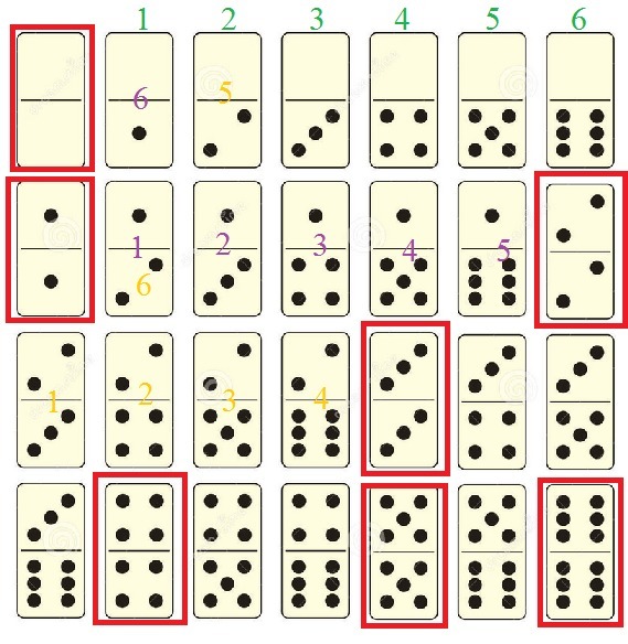 К дублю 0:0 можно выбрать 6 подходящих костей ( пронумерованы 1-2-3-4-5-6 зеленым цветом), точно так же к дублю 1:1 можно выбрать 6