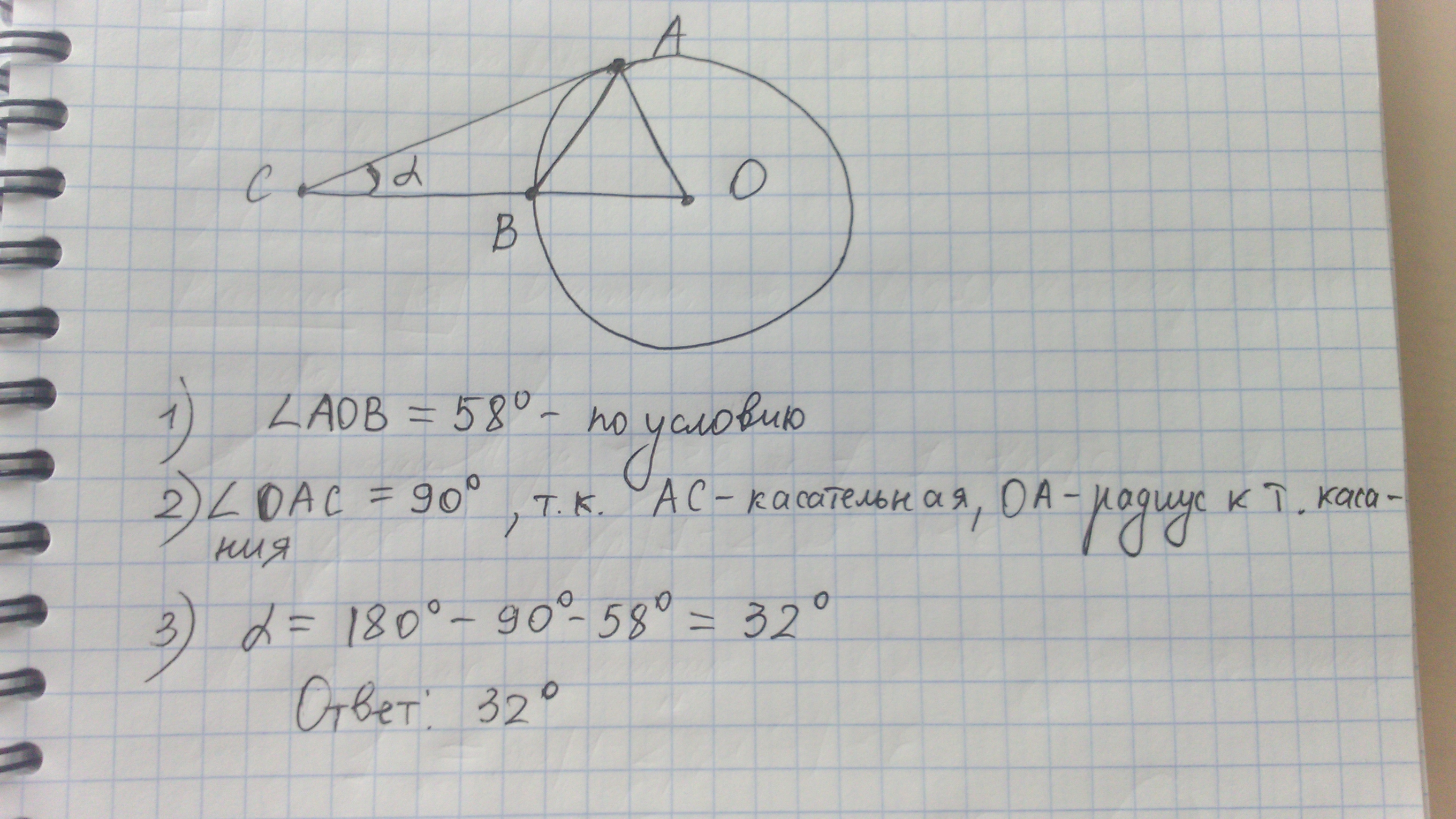 найдите угол aco если его сторона ca касается окружности в точке A, о-центр,отрезок OC пересекает окружность в точке B, а меньшая дуга окружности AB заключенная внутри этого угла равна 58 градусов