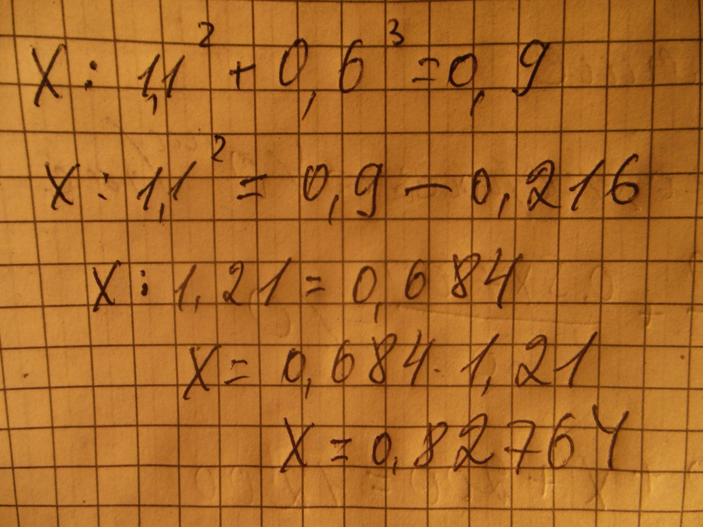 Х : 1,1 ^2 + 0,6 ^ 3 = 0,9