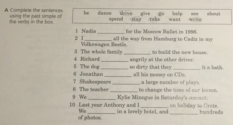 danced,. drove,. helped,. saw,. was. gave,. spent,, wrote,. wanted,. saw,. went. stayed. took