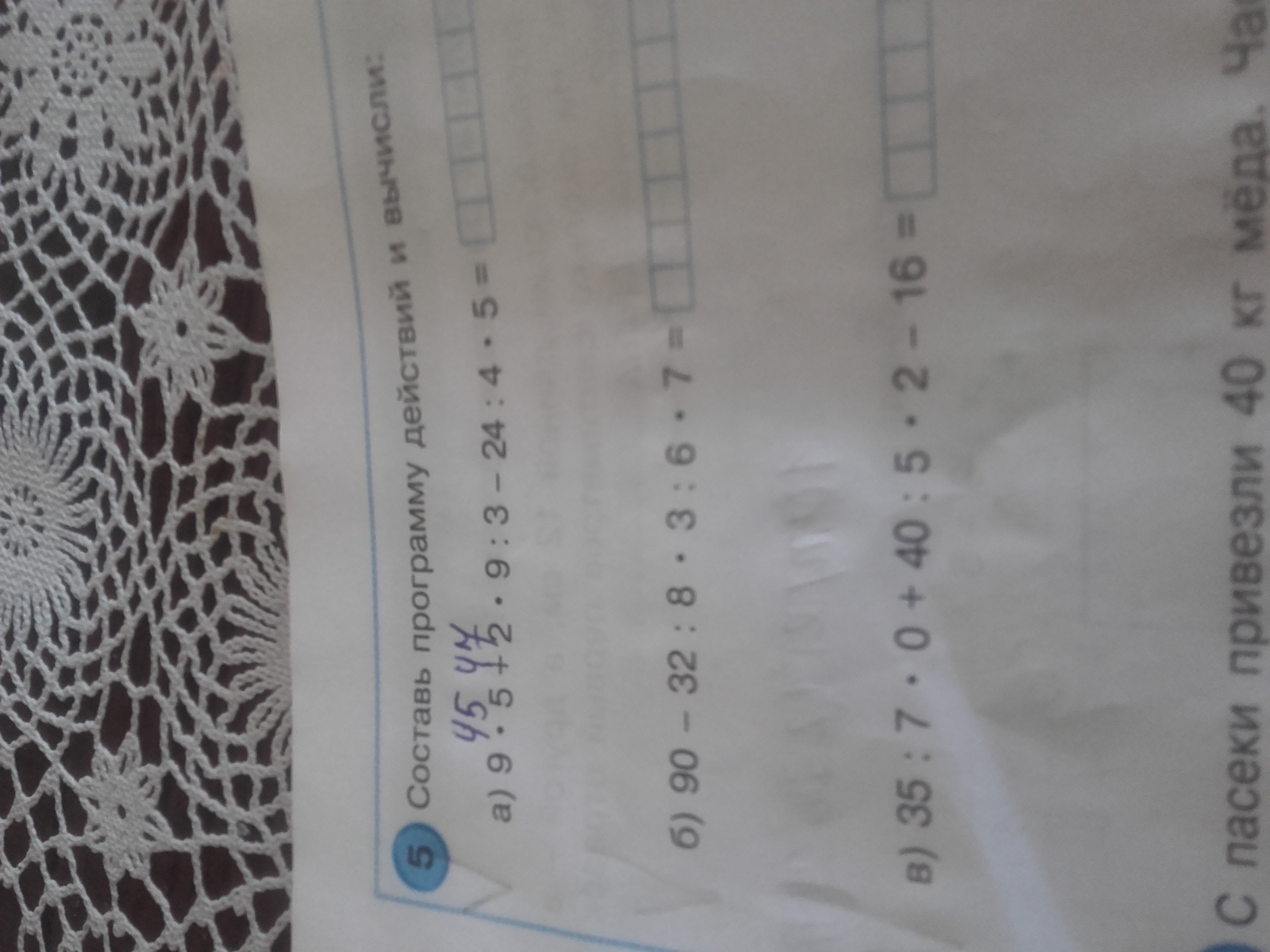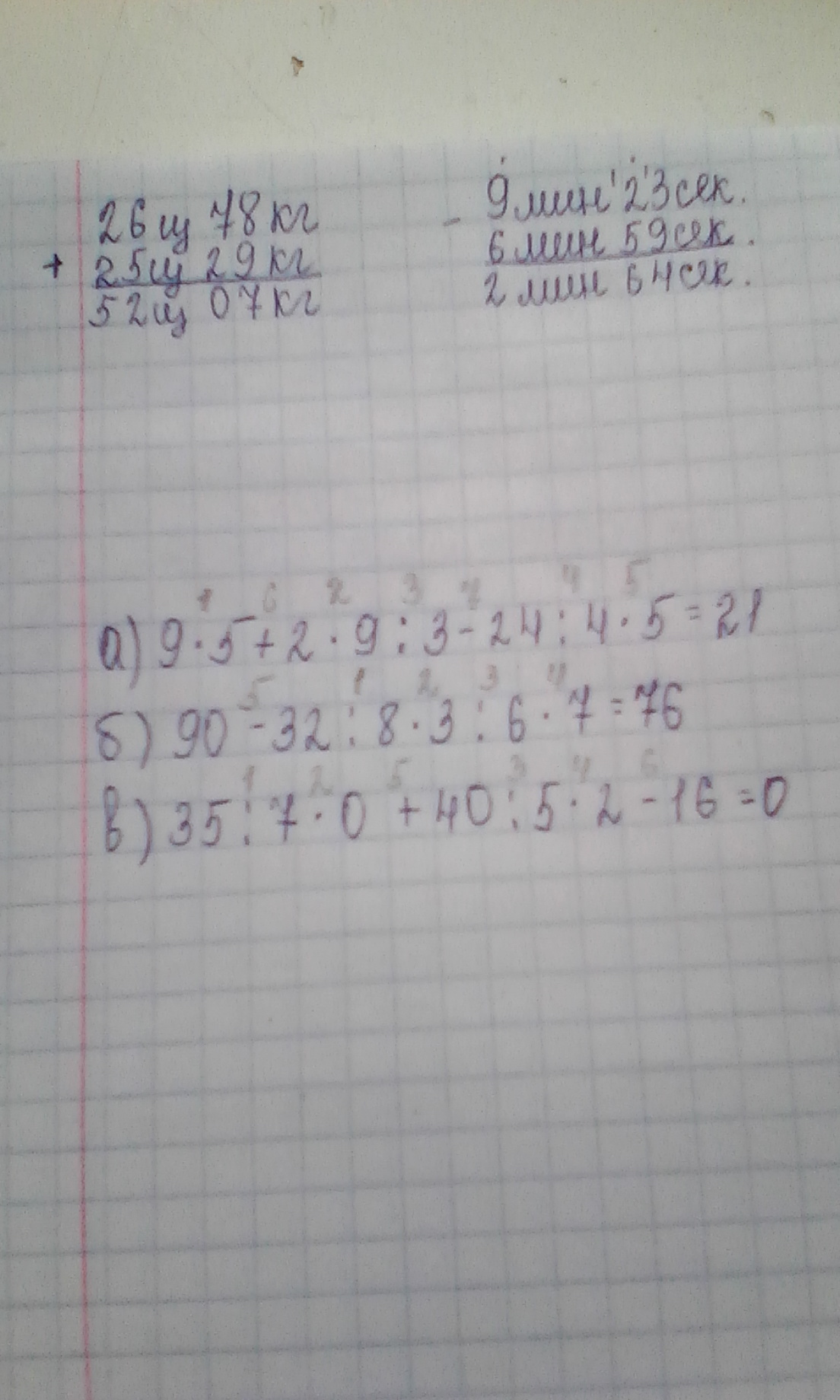 а) 9 * 5 + 2 * 9 : 3 - 24 : 4 * 5 = 45 + 18 : 3 - 6 * 5 = 45 + 6 - 30 = 51 - 30 = 21; б) 90 - 32 : 8 * 3 : 6 * 7 = 90 - 4 * 3 : 6 * 7 = 90 - 12 : 6 * 7 = 90 - 2 * 7 = 90 - 14 = 76; в) 35 : 7 * 0 + 40 : 5 * 2 - 16 = 5 * 0 + 8 * 2 - 16 = 0 + 16 - 16 = 0.