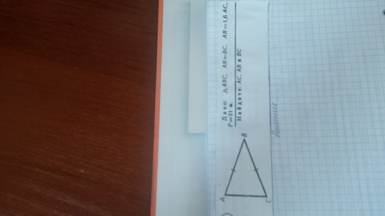 Согласно условию задачи АВ=ВС=1,6*АС, значит составим уравнение по формуле периметра треугольника Р=АВ+ВС+АС: