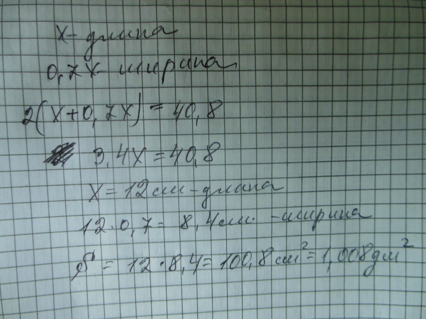 Ширина прямоугольника на 30% меньше длины А его периметр равен 40,8 сантиметра найти площадь прямоугольника выразите площадь в квадратных дициметрах