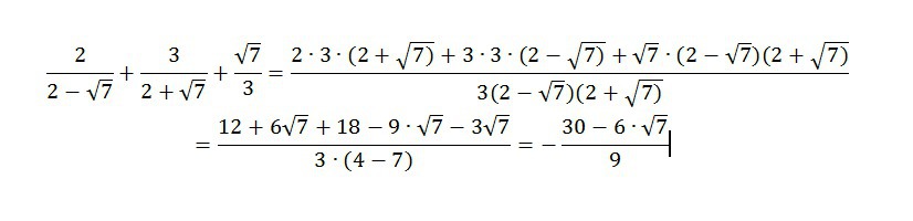 ( 2/( 2 - V7 ) ) + ( 3 / ( 2 + V 7 )) + ( V 7 / 3 ) = ( 2•3•( 2 + V7 ) + 3•3•( 2 - V 7 ) + V7•( 4 - 7 ) / ( 3•( 4 - 7 )) = ( 12 + 6V7 + 18 - 9V7 - 3V7 ) / ( - 9 ) = ( 30 - 6V7 ) / ( - 9 ) = ( 3•( 10 - 2V7 ) ( 3•( -3 )) = ( 10 - 2V7 ) /( -3 ) = - 3 1/3 + 2/3V7