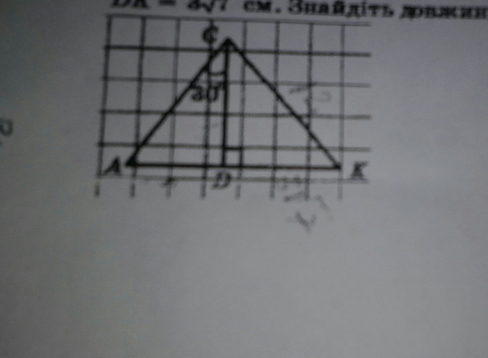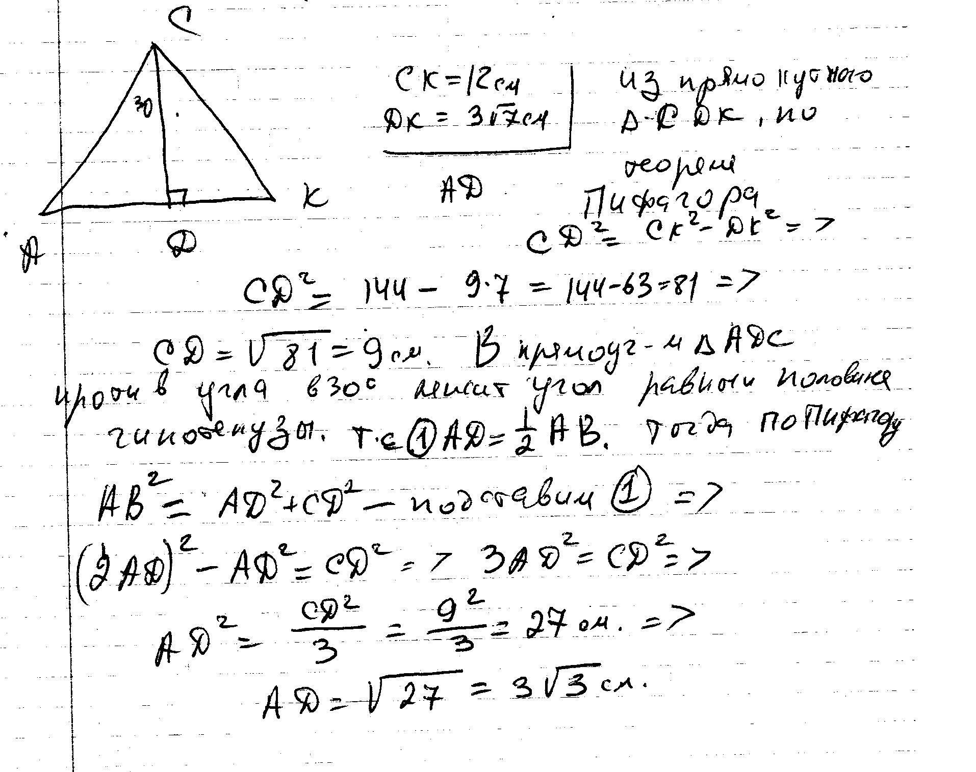 Вiдрiзок СD - висота трикутника АСК,зображеного на рисунку,СК-12см, DK-3√7см.Знайдiть довжину вiдрiзка АD. Решение полностью.
