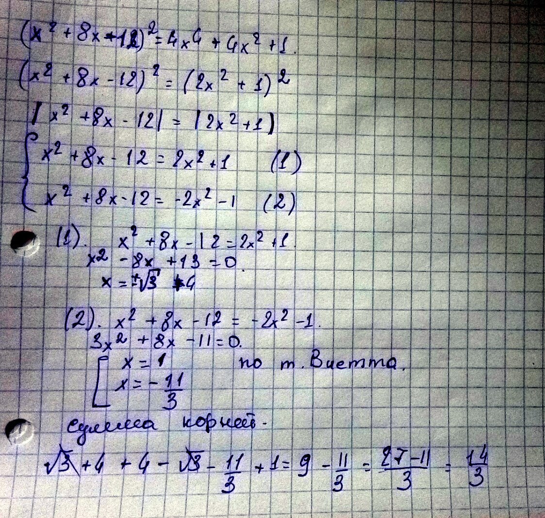 выражение в скобках оставим в левой части уравнения, а множители перенесем в правую часть уравнения. правую часть представляем как квадрат суммы. извлекаем корень. получаем уравнение с модулями. модуль раскрываем как систему, состоящую из двух уравнений.