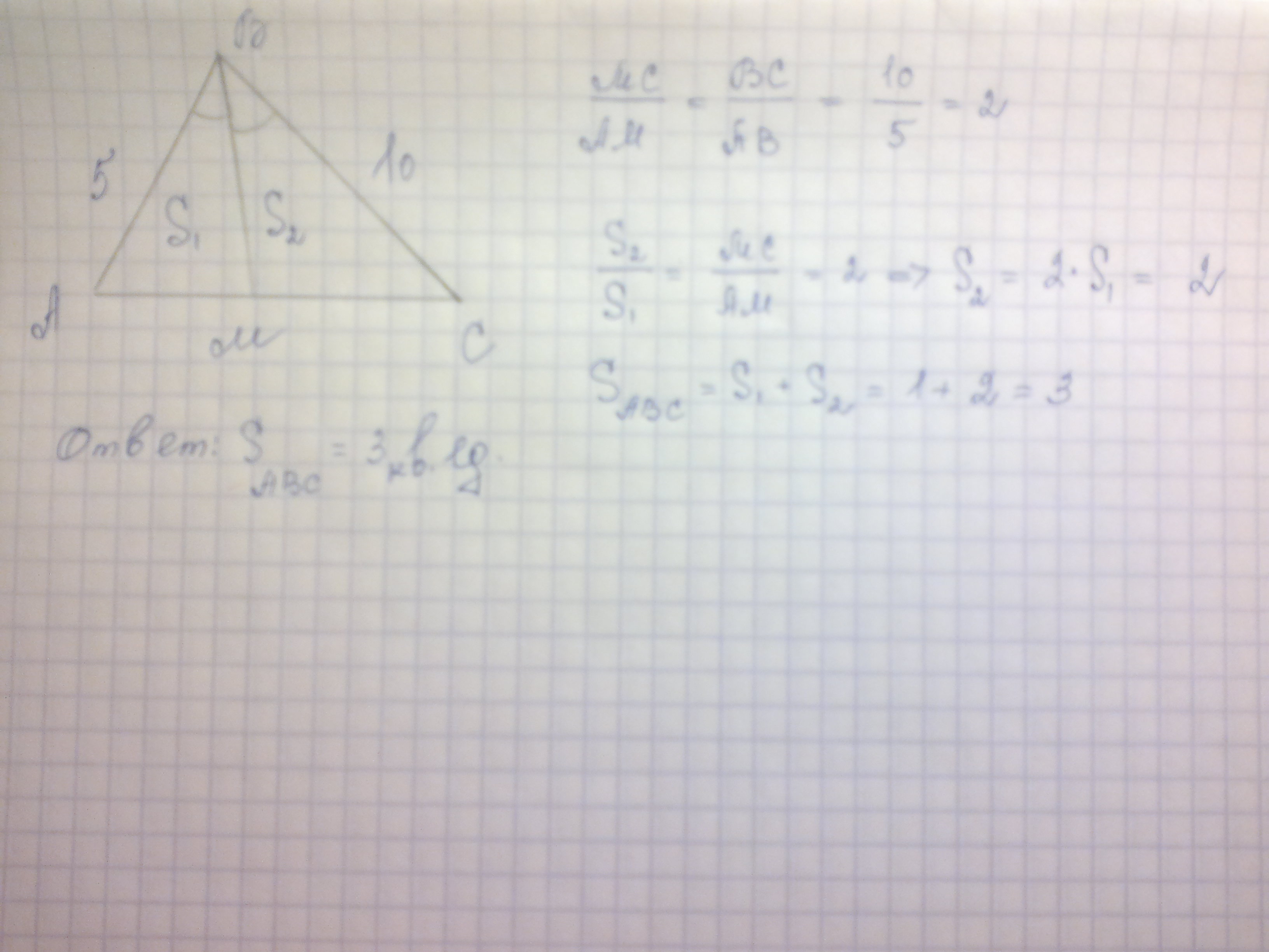 В треугольнике АВС дано : АВ=5 ; ВС = 10 ; ВК – биссектриса. S_ABK=1. Найти площадь треугольника АВС.....только без синусов и косинусов