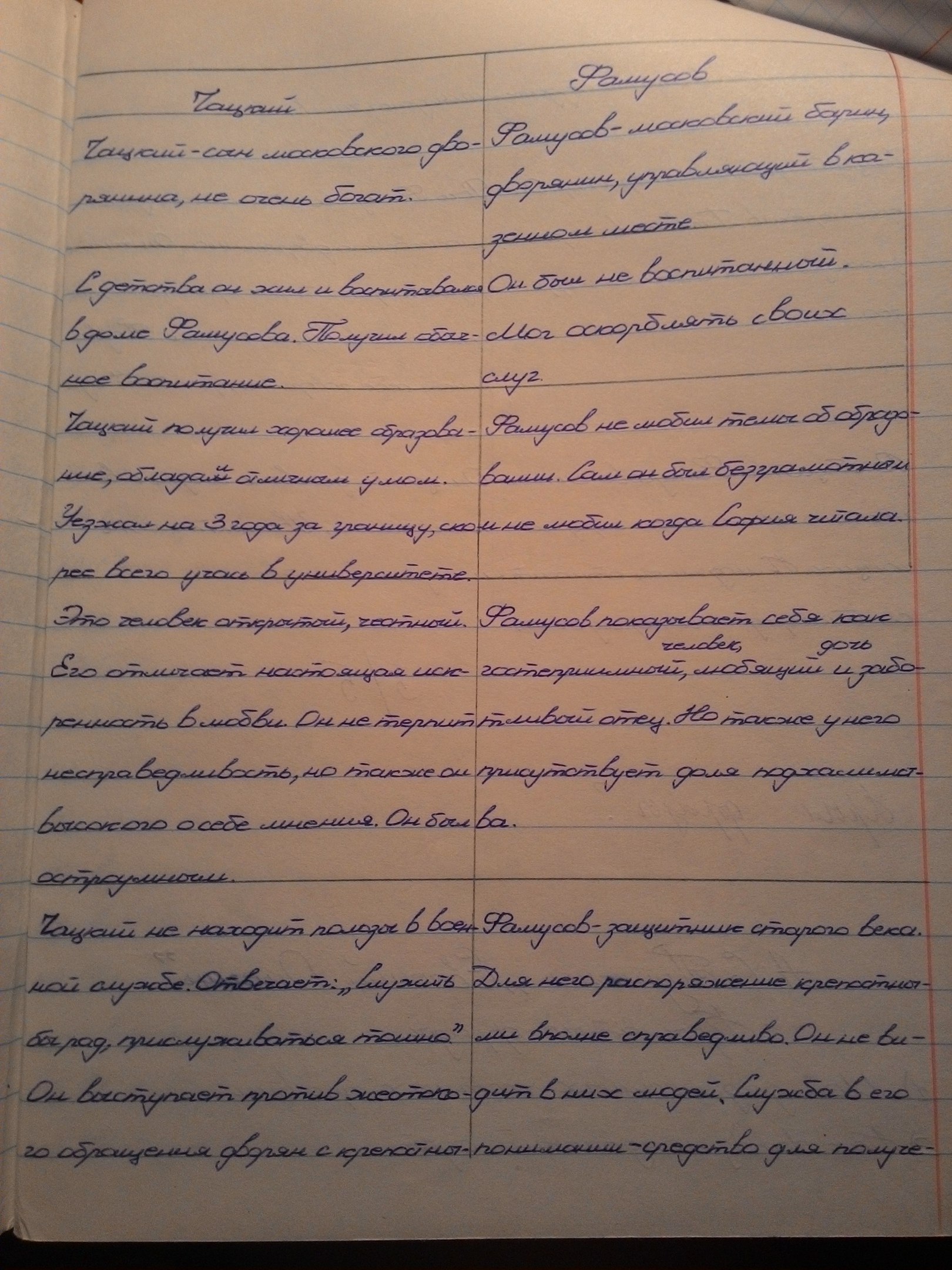 Из старых школьных записей нашла такую таблицу. Сравнение Чацкого и Фамусова. Можно воспользоваться описанием Фамусова, так как представители этого общества похожи.