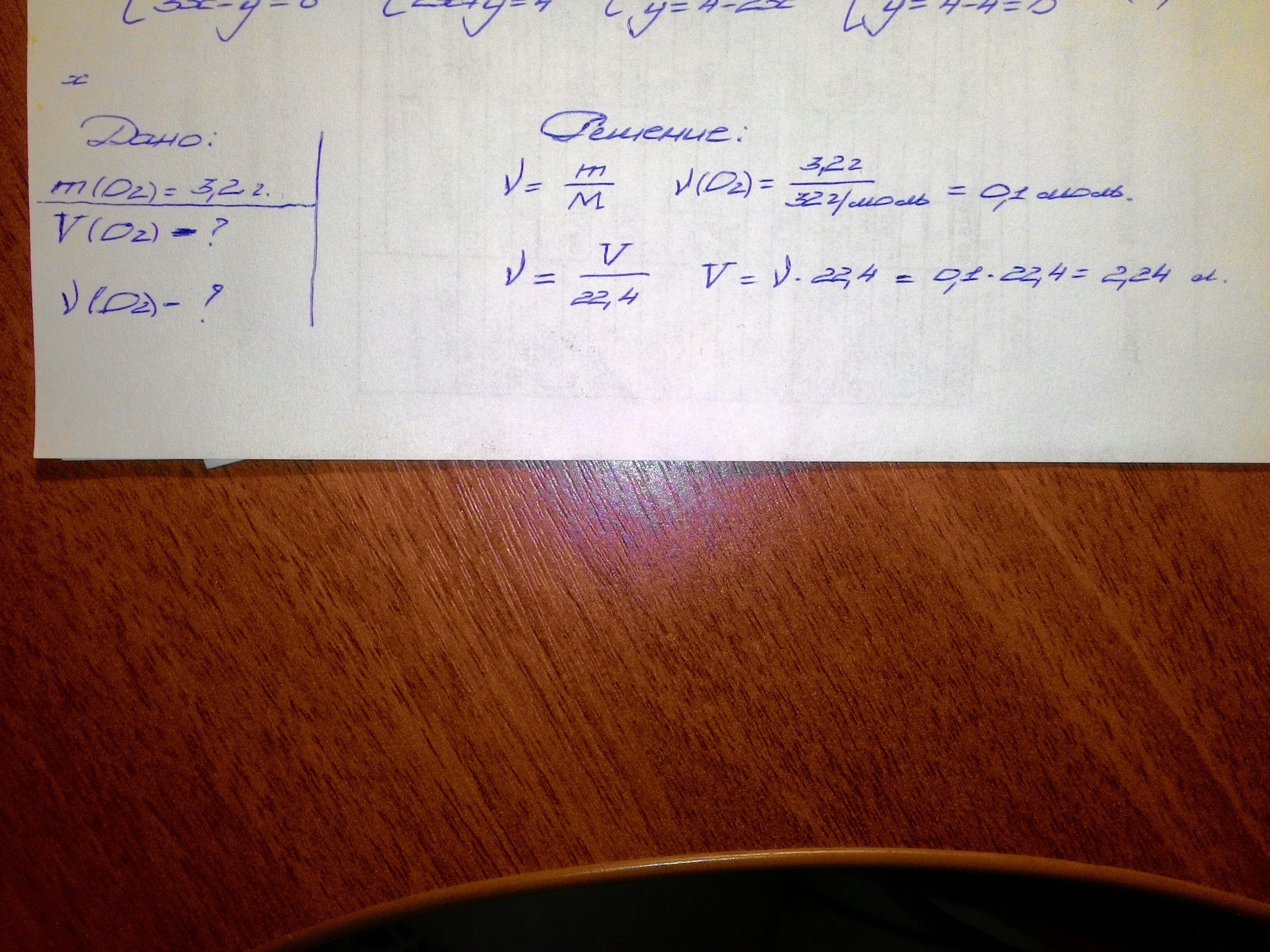 Рассчитать количество вещества в молях в кислороде массой 3,2 г, объем этого газа при нормальных условиях