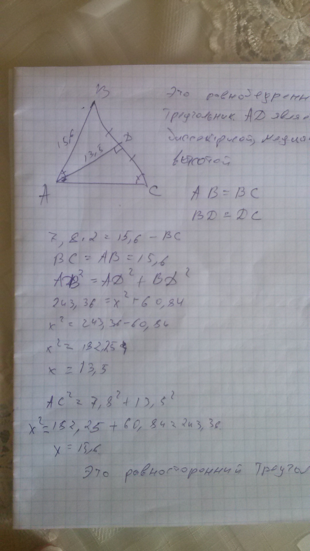 В треугольнике ABC угол А равен углу С, а высота AD делит сторону ВС пополам. Найдите АС, если BD равно 7,8 см. Заранее спасибо!
