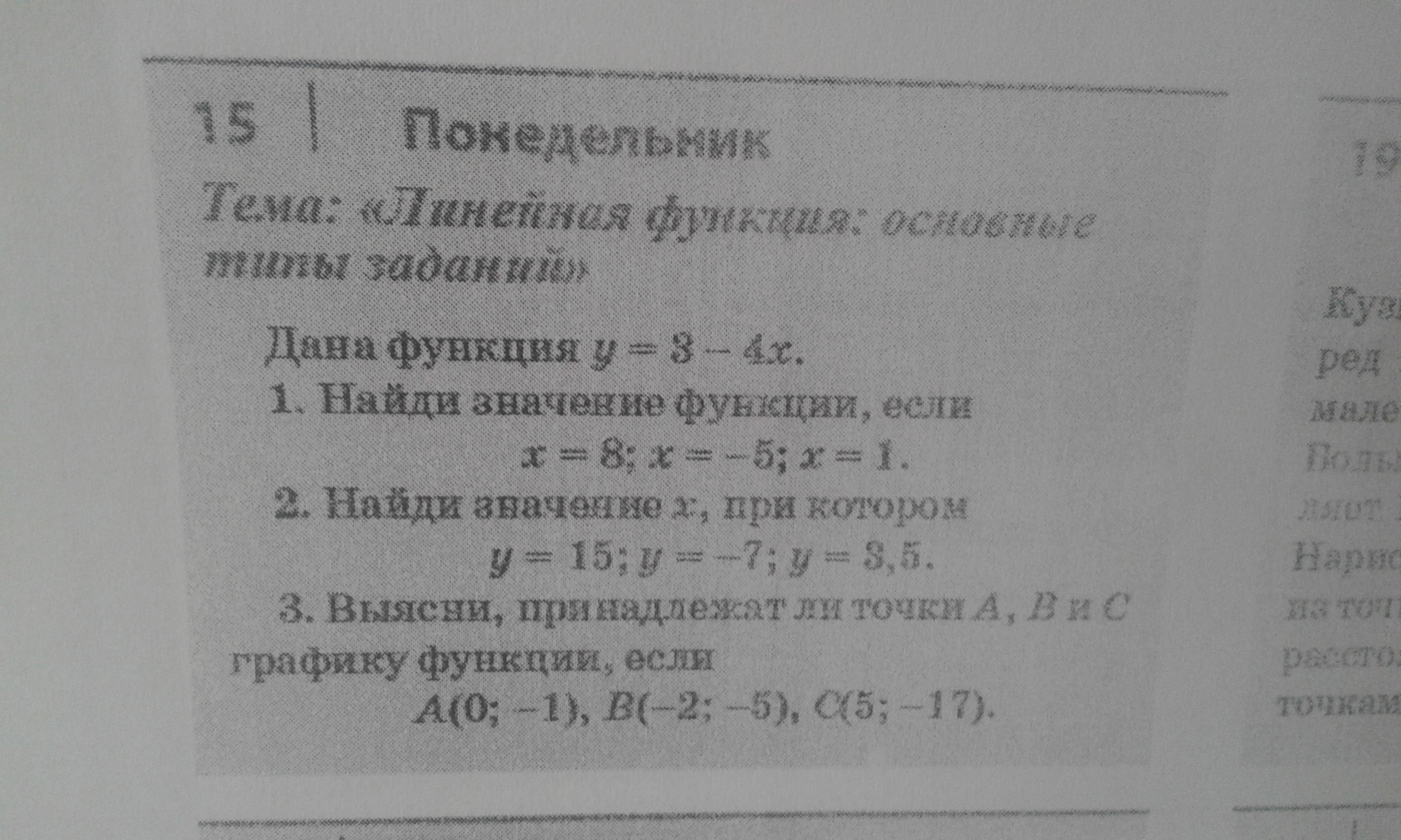 1. у (8) = 3 - 4*8 = -29; у (-5) = 3 - 4 * (-5) = 23; у (1) = 3 - 4 * 1 = -1. 2. х = (у - 3) : (-4); при у = 15 х = (15 - 3) : (-4) = -3; при у = -7 х = (-7 - 3) : (-4) = 2,5; при у = 3,5 х = (3,5 - 3) : (-4) = -0.125. 3. у (0) = 3; точка А не принадлежит. у (-2) = 11; точка В не принадлежит. у (5) = -17; точка С принадлежит.