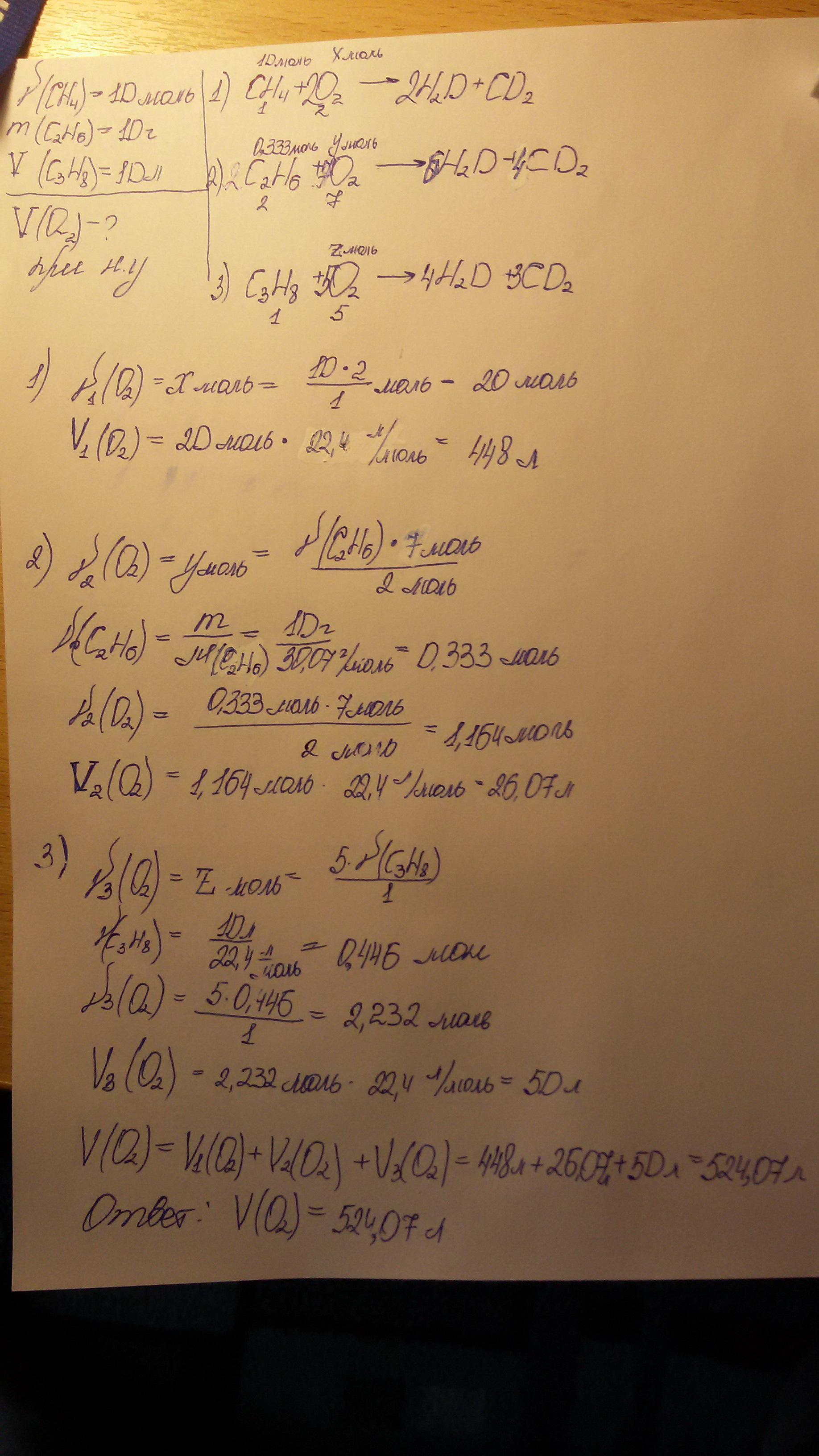 Найдите объём кислорода, необходимый для сжигания смеси, состоящей из 10 моль метана, 10 г этана и 10 л пропана(н.у.).