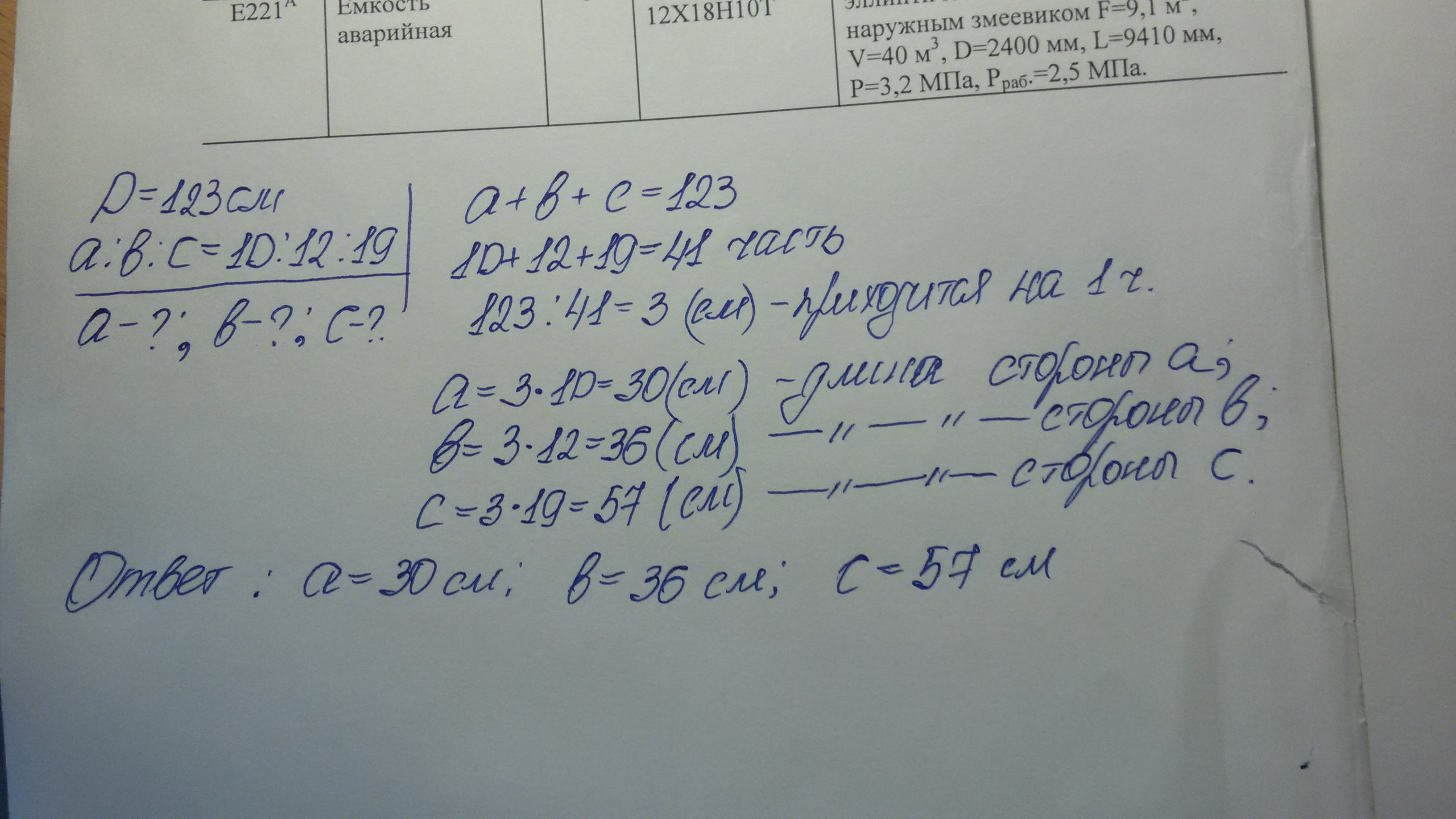 1)10+12+19=41 части в числе 123. 2)123:41=3(см) приходится на одну часть 3)3*10=30(см) одна сторона 4)3*12=36(см) вторая сторона 5)3*19=57(см) третья стоооа. Ответ: 30см, 36см, 57см