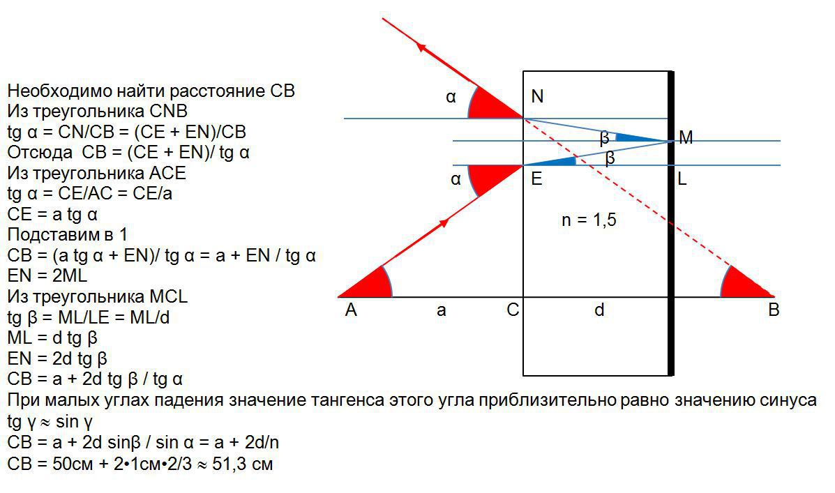 2) Толщина стекла зеркала (n=1,5) d= 1 см. Задняя стенка посеребрена. На каком расстоянии от наружной части зеркала будет находится изображение предмета, удалённого от неё на 50 см. (с рисунком)