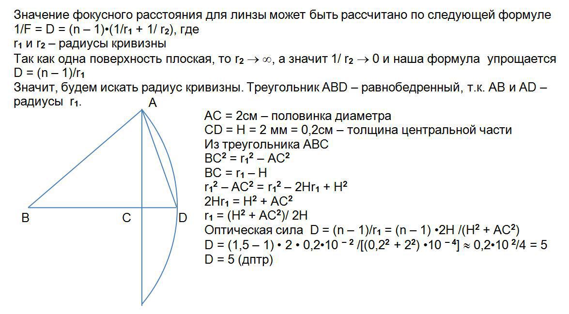 1) Найдите оптическую силу стеклянной (n=1,5) плоско-выпуклой линзы диаметром d=4 см, имеющей в центральной части толщину H=2 мм (с рисунком)