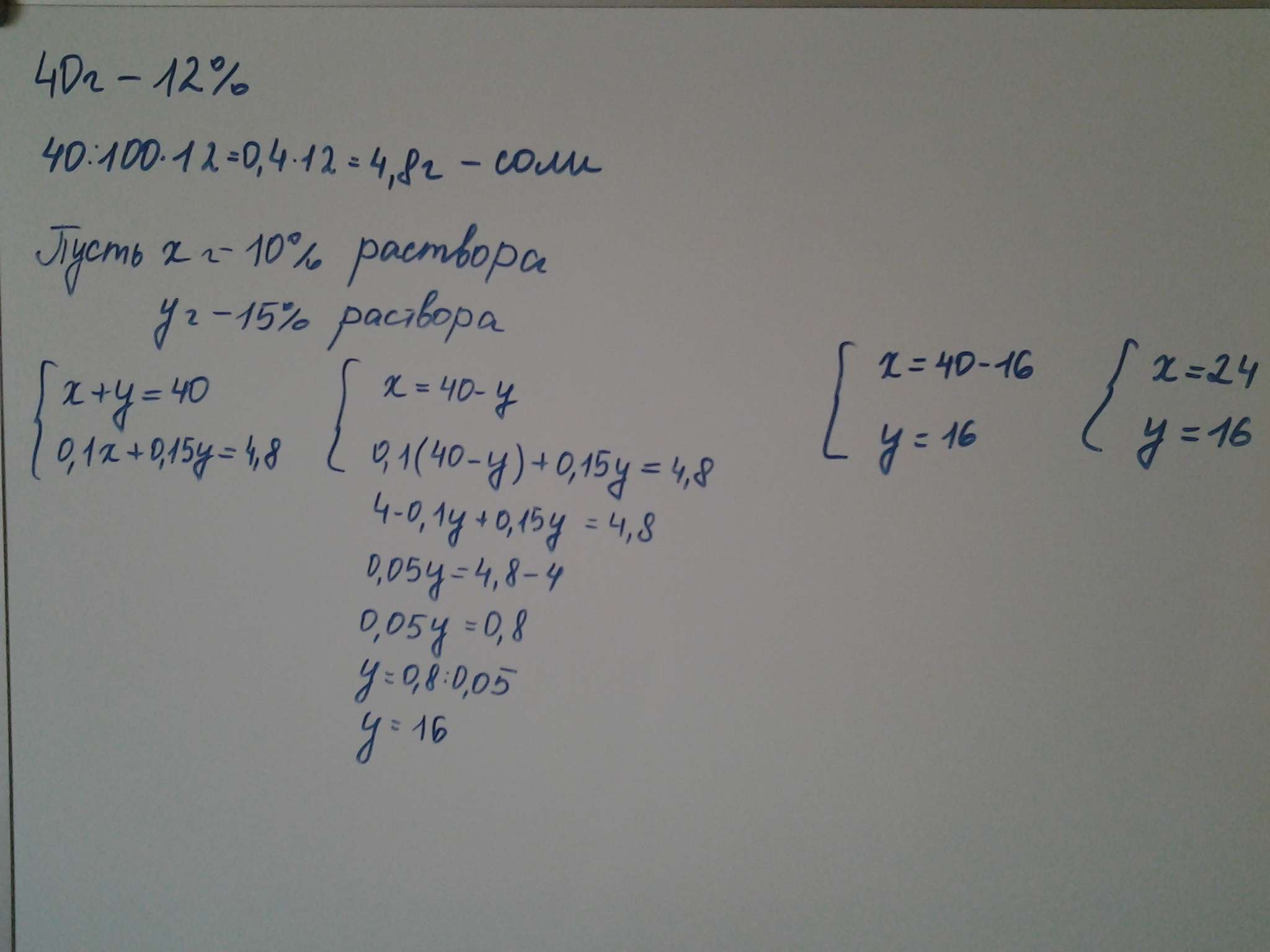 из двух растворов соли -10% и 15% - надо получить 40 г 12% раствора. сколько для этого надо взять каждова раствора?
