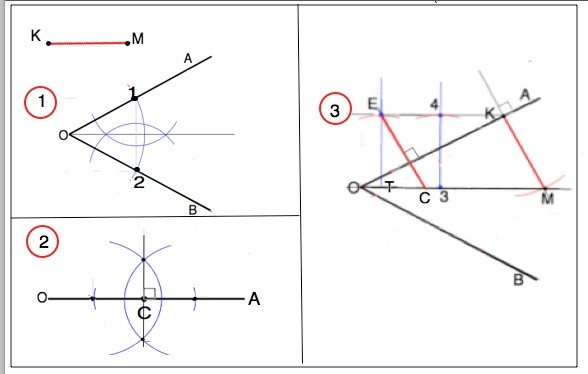 4. Из т.К проведем перпендикуляр к стороне ОА. Он пересечется с биссектрисой в т.М, параллелен ЕС, его длина равна длине заданного отрезка (свойство параллельных прямых, пересекающих другие параллельные прямые). .