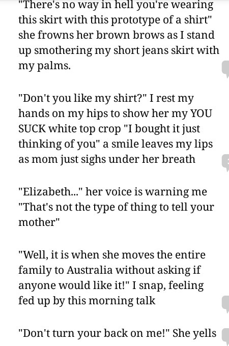 "Тебе не нравится моя футболка?"Я кладу свои руки на бёдра,чтобы показать ей свой отстойный короткий белый топ."Я купила это просто думая о тебе ".Улыбка сходит с моего лица,когда мама вздыхает себе под нос
