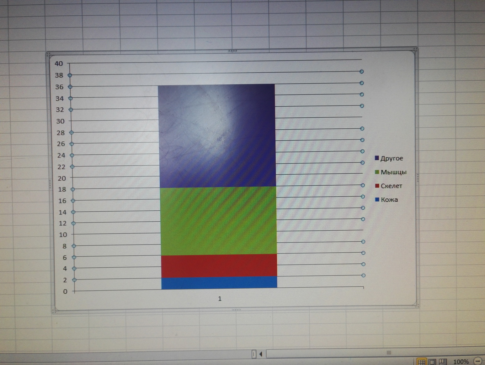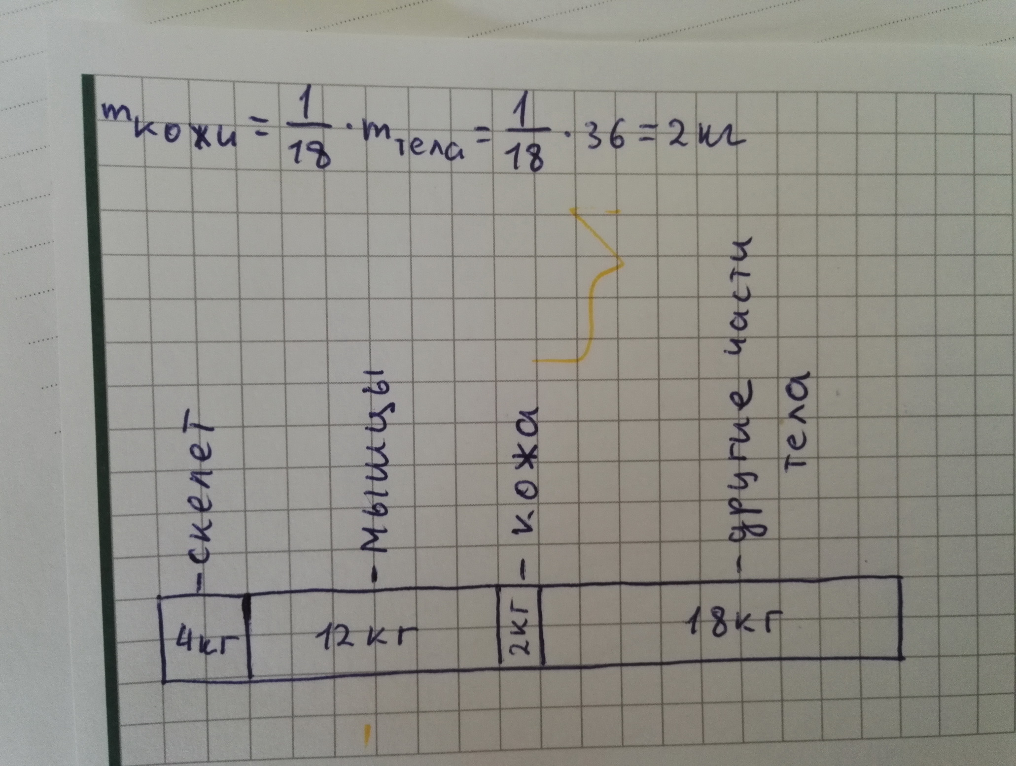 Масса ребенка в возрасте 8 – 10 лет примерно 36кг. Из них около 4кг составляет масса его скелета, 12кг – масса мышц. Масса кожи составляет восемнадцатую доля от массы тела человека. Остальное –масса других частей человеческого организма.