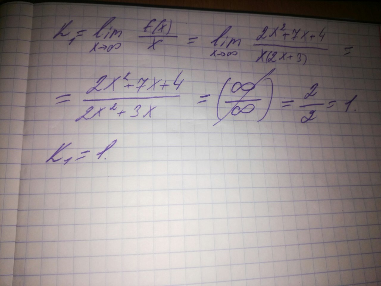 если функция задаётся дробью в которой в числителе и знаменателе стоят многочлены, то наклонную асимптоту можно найти делением числителя на знаменатель столбиком и то что получится в частном и будет наклонная асимптота (см.фото 1) у=kx+b