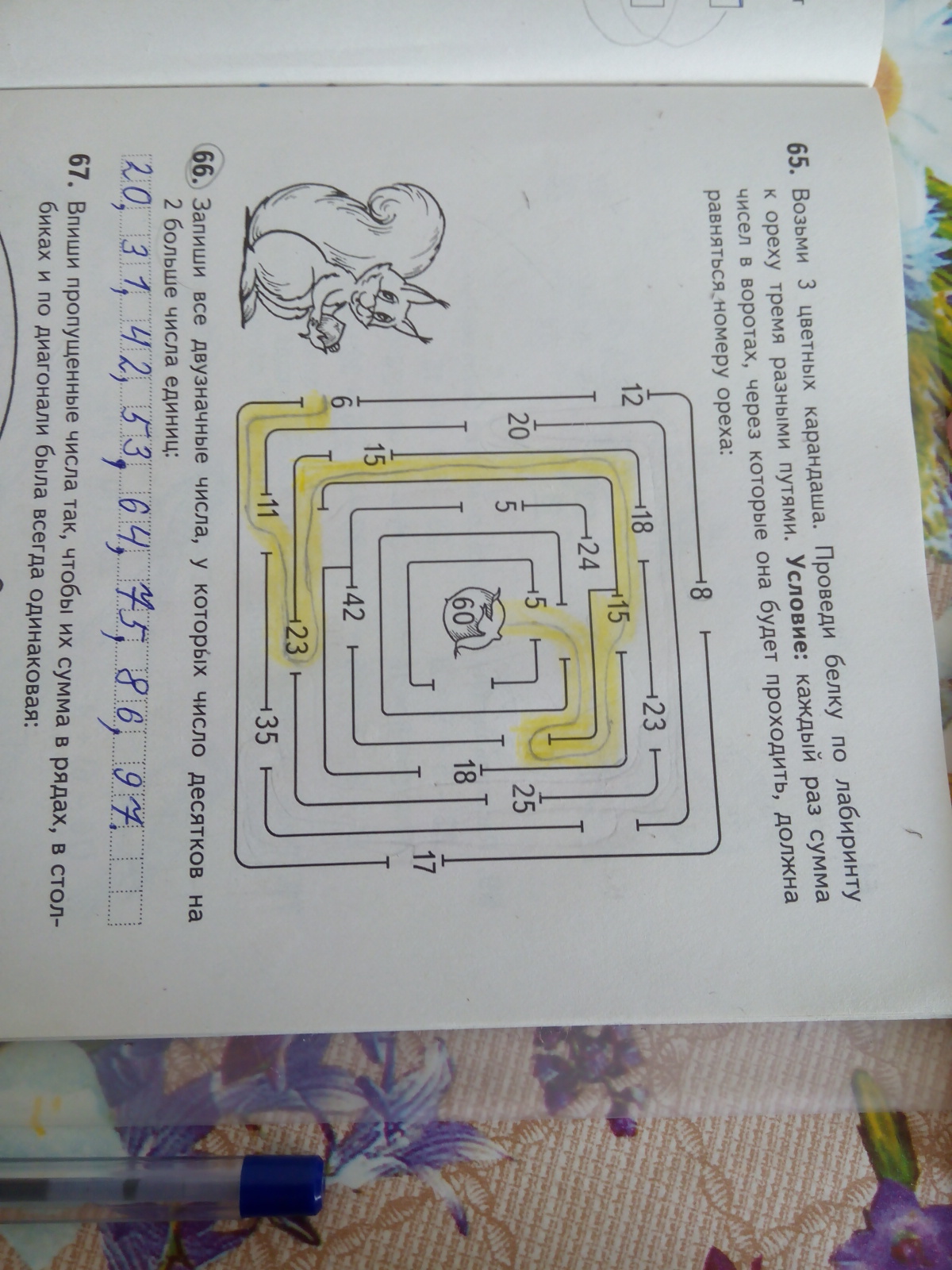 проведи белку по лабиринту к ореху тремя разными путями. каждый раз сумма чисел в воротах, через которые она будет проходить, должна равняться номеру ореха.