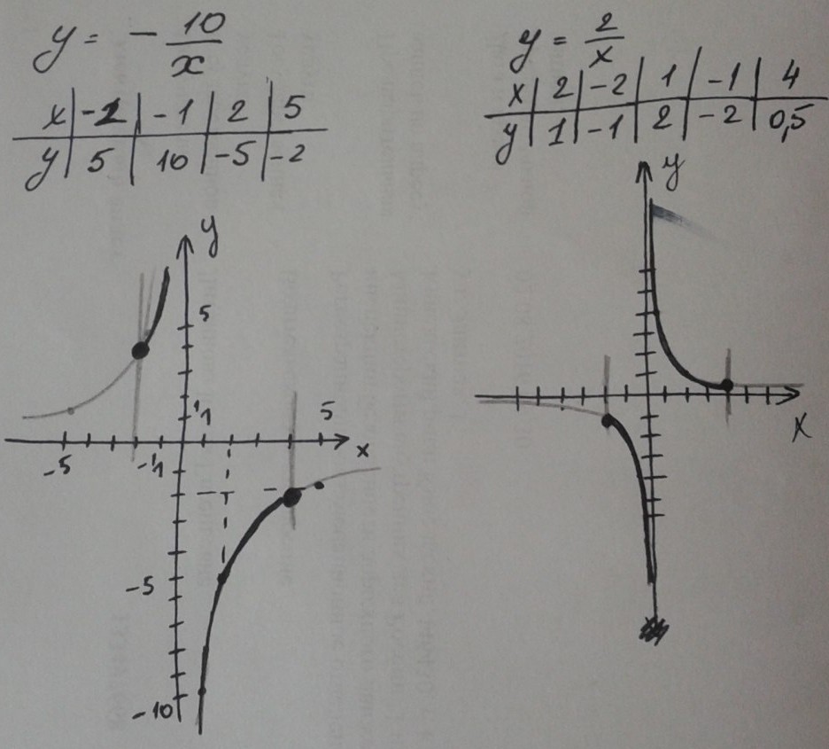 график имеет такой вид для 1... если конкретно по точкам то просто подставь -2 -1 1 2 3 4 и получишь и соедени плавной линией... для второго график будет распологаться в других четвертях и аналогично подставь значения чтобы найти конкретные точки