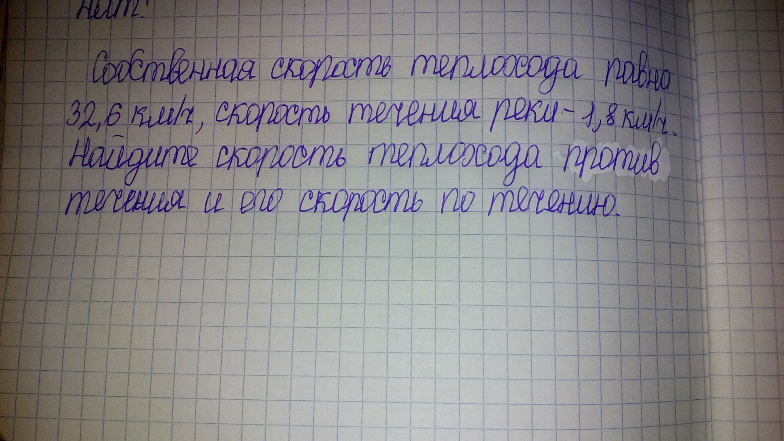 Скорость против течения реки 32,6км/ч - 1,8 км/ч =30,8км/ч