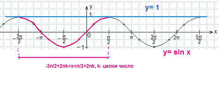 Так как синус функция периодическая и имеет период 2π, то получаем решение неравенства х ∈ (-3π/2+2πk;π/2+2πk), где k∈Z
