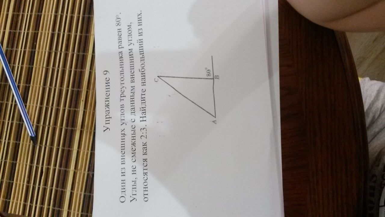 Задачу можно не решать , а просто логически рассудить : внутренний ∠В=180-80=100° ( как смежный с внешним углом ) , сумма углов А и С равна внешнему углу В, то есть 80°. Значит , наибольшим углом будет угол В в треугольнике АВС.