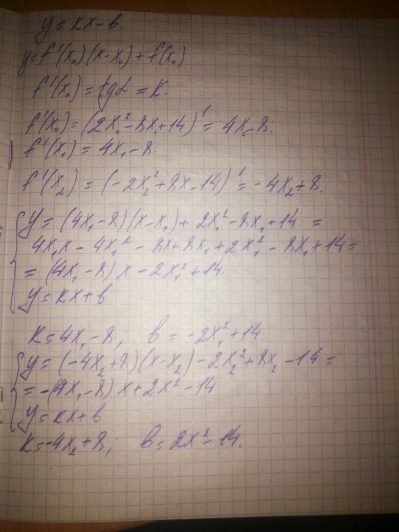 синяя прямая имеет вид: у=kx+b, также я сказал, что она является касательной: у=f'(x₀)(x-x₀)+f(x₀). Опираясь на это, составляем уравнение касательной для верхней и нижней парабол.