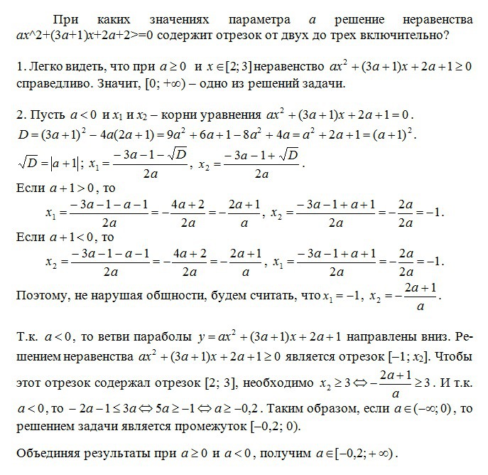 при каких значениях параметра а решение неравенства ах^2+(3a+1)x+2a+2>=0 содержит отрезок от двух до трех включительно?