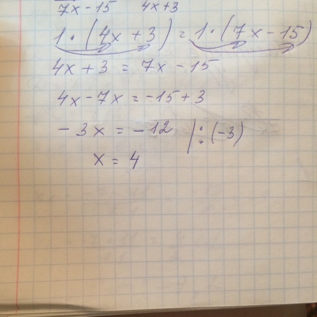 4х-7х= -15 -3 ( при переносе членов из одной части в другую, знаки меняем на противоположные)