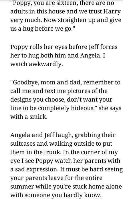 "Поппи, тебе всего 16, и в доме не будет никого из взрослых, а Гарри мы очень доверяем. А теперь подойди-ка и обними нас на прощание."