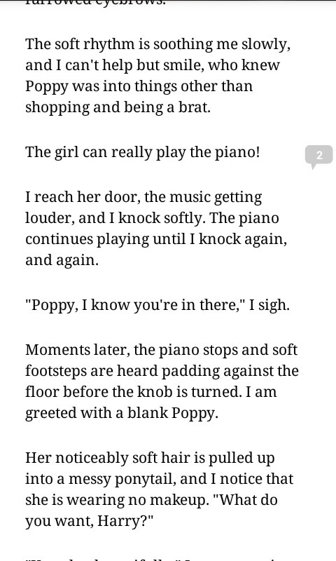Я подхожу к её комнате,музыка становится громче,я мягко стучу в дверь. Фортепиано продолжает играть,пока я не стучу снова и снова.